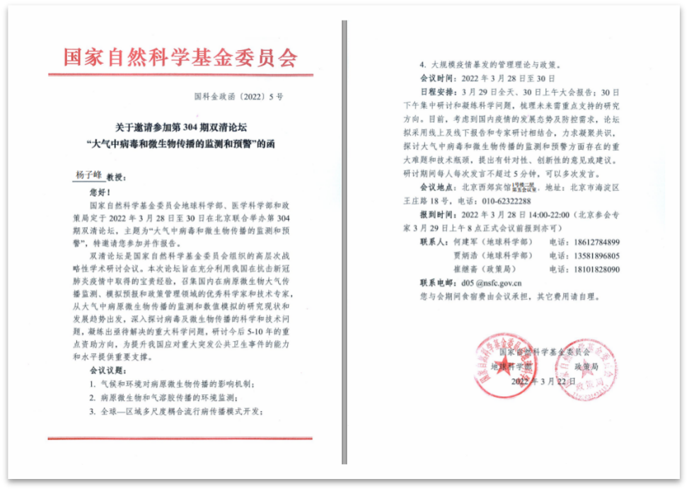 钟南山院士和杨子峰教授于2022年3月28日至30日受邀参加国家自然科学基金委地球科学部、医学科学部、政策局联合举办第304期双清论坛,主题为“大气中病毒和微生物传播的监测和预警”,大会由兰州大学黄建平院士、北京大学朱彤院士及中心/实验室/广州呼吸健康研究院副院长杨子峰教授出任大会共同主席,这也是广州呼吸健康研究院首次主持基金委跨学部战略研讨会。