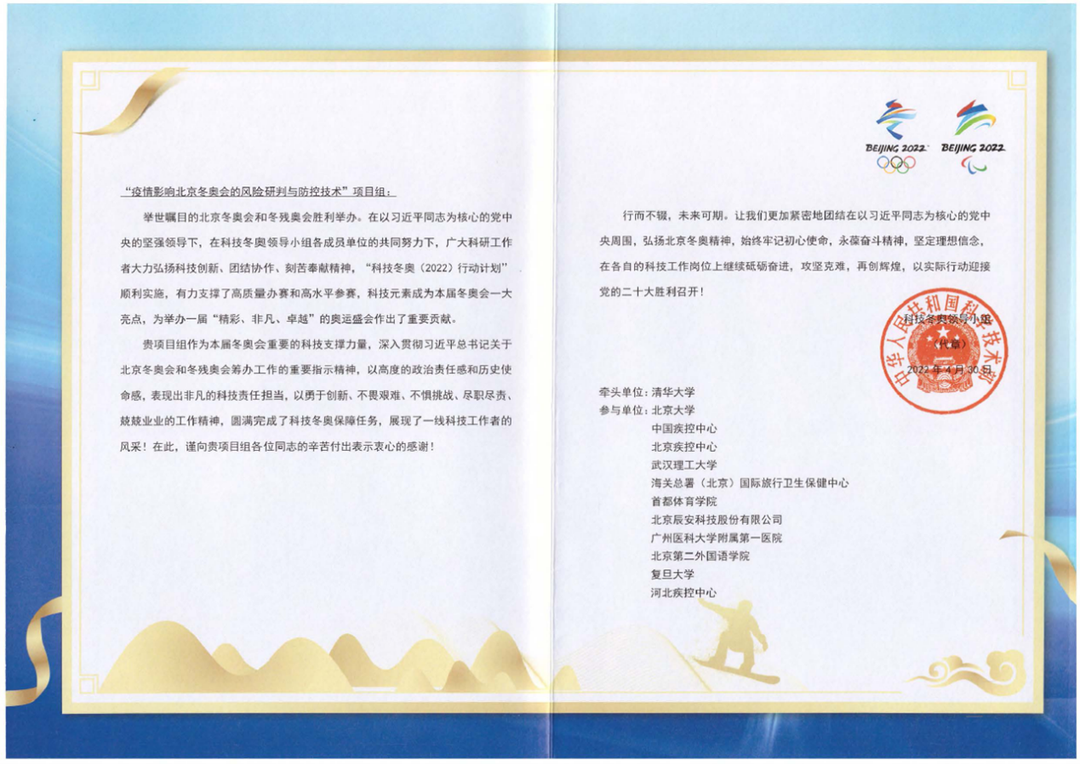 图4 国家科技部科技冬奥小组致函感谢项目组负责人