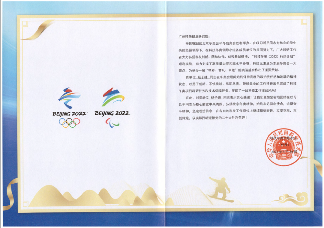 “科技冬奥”专项在昨天也成功举行项目专家验收大会,项目研究成果获得专家的一致认可,并收到科技冬奥领导小组的感谢信。广州医科大学附属第一医院国家呼吸医学中心团队由广州实验室、广州呼吸健康研究院、澳门科技大学的专家学者组成,包括广州实验室、广州呼吸健康研究院杨子峰教授、郑劲平教授、曾志奇博士,澳门科技大学韩子天副教授、唐嘉乐博士等。