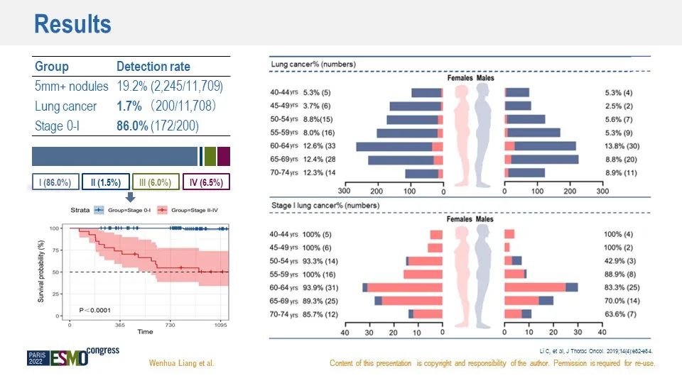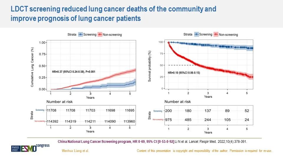 使用来自同一社区的约11万居民的未筛查人群作为对照,发现LDCT筛查减少了63%的肺癌相关死亡,风险比(0.37)远低于中国国家一次性筛查项目的风险比(0.69),这一差异可能归因于项目中包含了所谓的非高风险人群。筛查组的肺癌预后始终优于非筛查组,可能归因于早期疾病的比例较高。