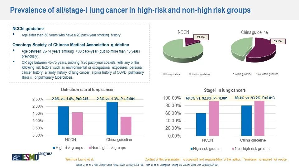 被检出肺癌患者中,只有19.6%和55.6%符合NCCN指南和中国共识的标准。提示如果限制CT接受者符合当前标准,将遗漏一半以上已被发现的肺癌病例。NCCN指南定义的高危人群和非高危人群的检出率没有差异。中国共识高风险组的检出率较高,但非高风险组检出率仍然不容忽视。此外更发现,根据这两个标准,非高危人群中I期肺癌的比例更高。提示必须扩大目前的标准,以适应中国的肺癌特征。