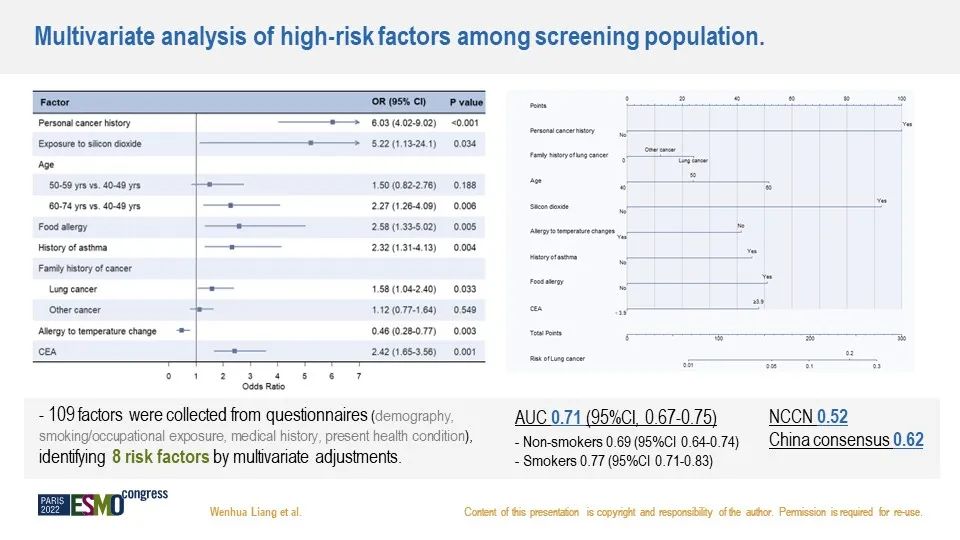从涉及人口统计学、吸烟/职业暴露、病史和当前健康状况的问卷中收集了109个因素。经过多变量调整后,发现个人癌症史、二氧化硅暴露、老年、食物过敏、哮喘史、肺癌家族史是独立的危险因素,而对温度变化过敏可能是保护性的。使用这些显著变量,结合CEA(界值3.9),综合预测模型的AUC为0.71,显著高于NCCN指南和中国共识中的标准。