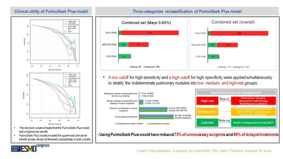 决策曲线显示PulmoSeek Plus模型是五种现有模型中临床净效益最好的。在PulmoSeek Plus的临床应用中,同时应用了高灵敏度的低截止值和高特异性的高截止值,将不确定的肺结节分为低、中、高风险组。通过重新分类,PulmoSeek Plus将减少89%的不必要手术和73%的延迟治疗。
