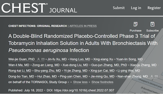 近期,由国家呼吸系统疾病临床医学研究中心、广州呼吸健康研究院关伟杰研究员等全国学者共同组织牵头的妥布霉素吸入溶液治疗伴铜绿假单胞细菌(PA)感染的支气管扩张症(简称“支扩症”)III期临床研究试验结果在国际权威医学期刊《Chest》(美国胸科医师学会的官方刊物)发表。该研究为目前支扩症全球最大样本量(357例)的全国33家中心协同合作的临床研究,率先针对雾化吸入抗生素治疗支扩的临床试验采用了双研究终点(细菌负荷+生活质量)。结果显示:对伴PA感染的支扩症患者,妥布霉素雾化吸入治疗可显著降低痰液PA负荷,减少24小时痰量,降低痰脓性评分,并显著改善患者的生活质量。