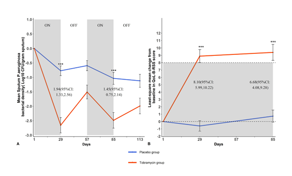 结果显示:双主要疗效终点指标,妥布霉素组均显示出优效性。与安慰剂组相比,妥布霉素组患者在治疗后第29天痰液PA的负荷较基线显著降低(均值:2.50 vs. 0.76 Log10CFU/g, P<0.001),QOL-B-RSS评分较基线的改变量显著提高(均值:8.48 vs. 0.56, P<0.001)。妥布霉素组不良事件发生率(81.6%)与安慰剂组(81.5%)相当,妥布霉素组发生呼吸困难和呼吸急促的不良事件很少(分别仅2.2%和1.1%),表明妥布霉素吸入溶液诱发气道痉挛的概率极低。因此,妥布霉素吸入溶液可有效降低支扩患者气道内的PA负荷、提高PA清除率,显著改善支扩患者的生活质量,安全性和耐受性良好。