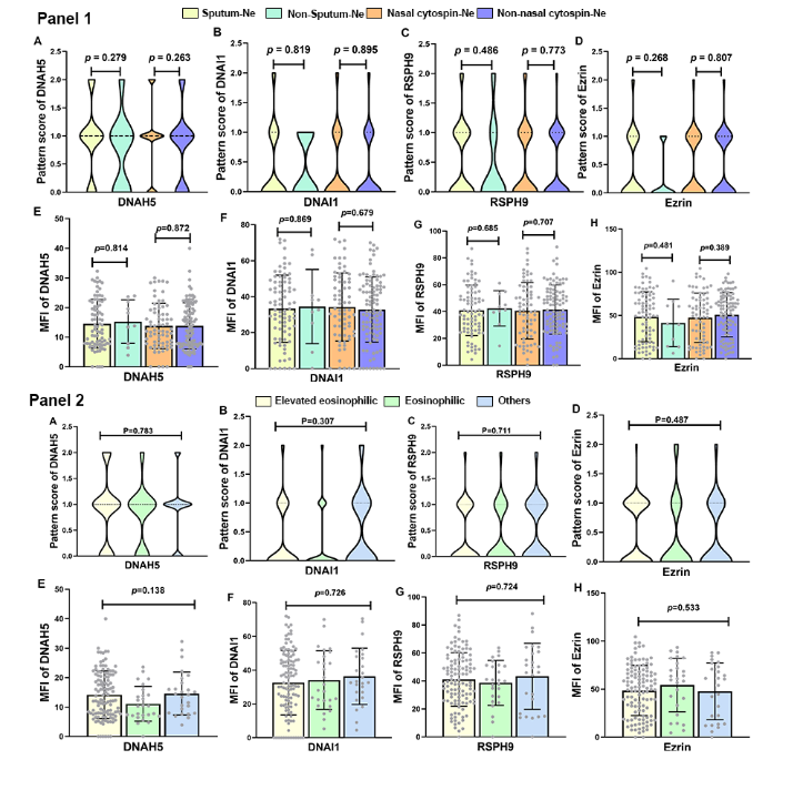 临床上评价MCD有多种检查方法,包括透射电镜、基因检测、免疫荧光显色、高速摄像机拍摄纤毛摆动频率等。在众多检查中,透射电镜检查能直接评价纤毛超微结构,然而其耗时、检测费用高、对仪器和操作人员要求较高,且不能识别部分纤毛生成标记物(如CP110、 FOXJ1、TAP73)表达异常。免疫荧光显色能在一定程度上作为透射电镜的替代手段,且能有效分析纤毛生成标记物的异常。本课题组的研究聚焦于四个纤毛标记物,因其均与气道疾病(例如慢性鼻-鼻窦炎、过敏性鼻炎、哮喘、慢阻肺)的相关,且对纤毛清除功能具有决定性作用。DNAH5或DNAI1的缺失可能导致外部动力蛋白臂异常和纤毛摆动幅度和频率降低, 而RSPH9的缺失可能影响辐条和中央微管的稳定性。Ezrin则是一种重要的纤毛生成标志物,重症哮喘患者中ezrin表达水平显著下降。