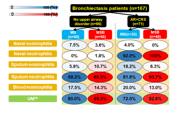 图4. 支扩患者上、下气道炎症类型比例与纤毛标记物异常比例示意图