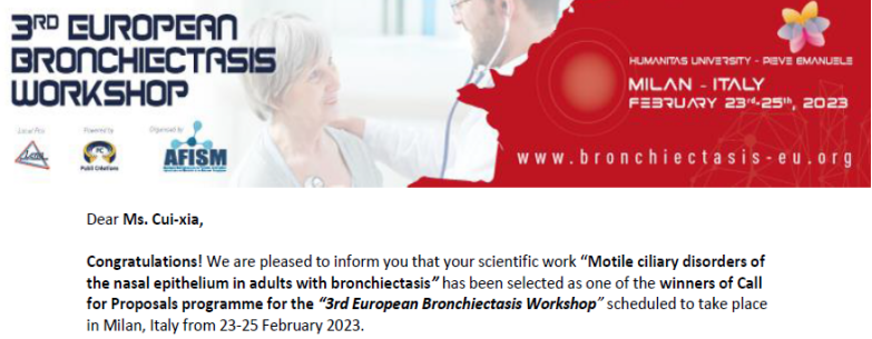 本研究在发表后,迅速引起了国际同行的关注。近日,第三届欧洲支扩学组年度筹备委员会向课题组发来了贺电,录用了纤毛病变研究成果作为明年初在意大利米兰举行的大会特邀口头报告(图5)。