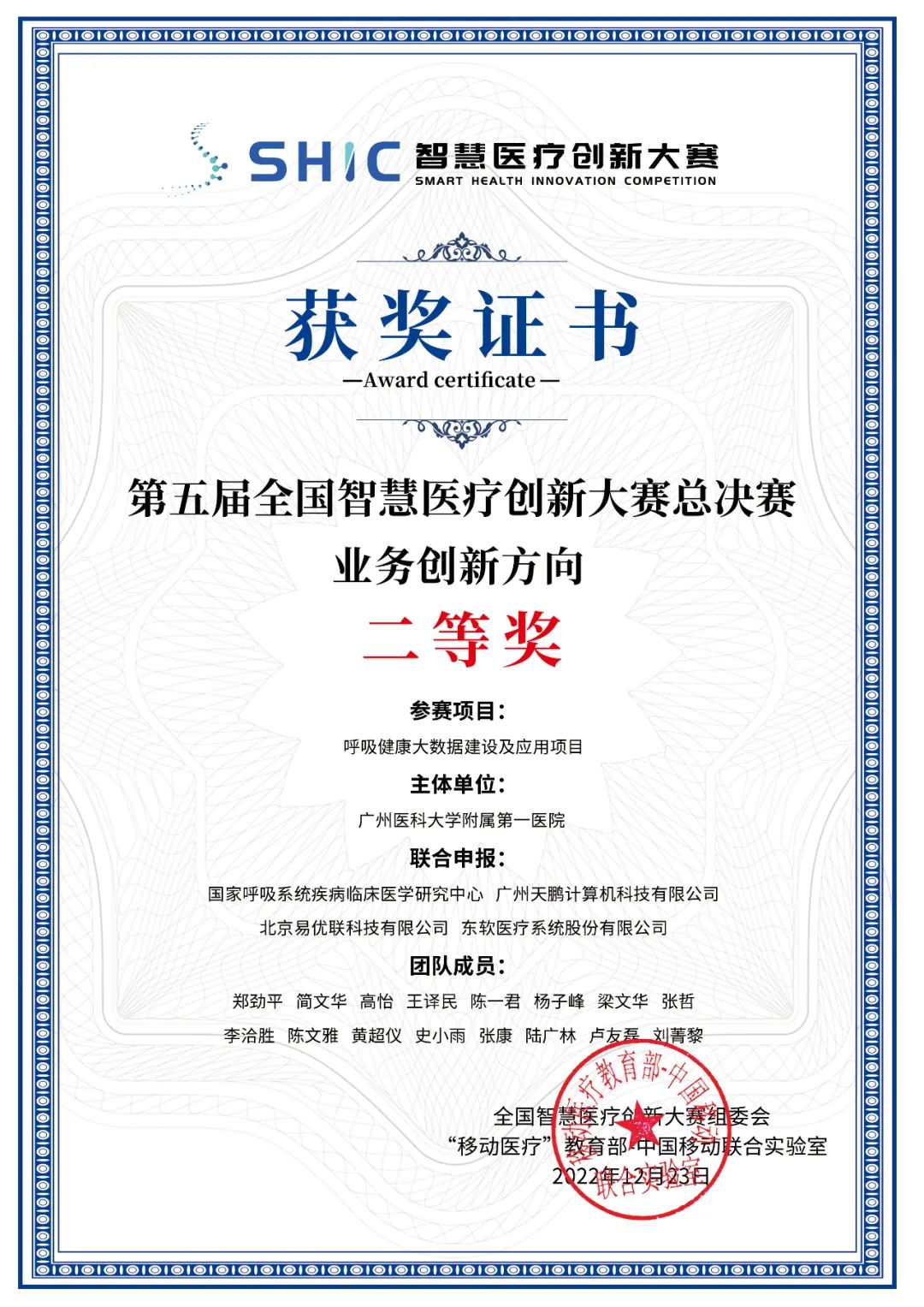 经过广东省内分赛区报名、初审、赛区决赛等环节的角逐,广医一院“呼吸健康大数据建设及应用项目”从众多队伍中脱颖而出,获得一等奖并晋级总决赛。晋级全国总决赛的优秀团队围绕业务应用创新方向、技术创新方向、基层卫生专题赛、医疗信创专题赛这四大赛题方向展开激烈角逐,由几十位来自国内医疗卫生信息管理与应用、技术、投资等领域的专家学者、领军人才等组成的专家评审团从不同角度对入围决赛的优秀项目进行严格评选。最终,广医一院“呼吸健康大数据建设及应用项目”在总决赛中大放异彩,得到了专家评委们的一致赞赏,斩获大赛二等奖,展现了我院的信息建设团队在卫生信息与健康医疗领域的创新能力与水平。