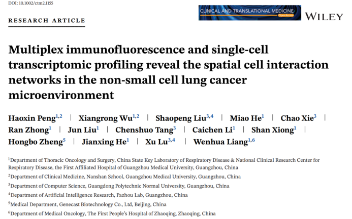 2023年新年伊始,国际知名学术期刊Clinical and Translational Medicine (IF 8.55, JCR: Q1)在线发表了广州医科大学附属第一医院、国家呼吸医学中心、国家呼吸系统疾病临床医学研究中心何建行/梁文华教授团队联合广东技术师范大学卢旭教授团队在肺癌微环境领域的最新研究成果,题为“Multiplex immunofluorescence and single-cell transcriptomic profiling reveal the spatial cell interaction networks in the non-small cell lung cancer microenvironment ” (1)的研究。其中,何建行/梁文华教授团队的彭浩欣、吴相荣、贺苗医生,卢旭教授团队刘少鹏博士为第一作者。