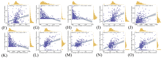 (1)癌巢内巨噬细胞、CD8+CD133+ T细胞的含量,基质内CD4++ T细胞、CD8+ T细胞、PD-L1+细胞的含量,CD133+ 肿瘤干细胞间连接数目、CD8+ T细胞间连接数目,CD4+ T细胞与CD20+ B细胞间距离、CD4+ T细胞与中性粒细胞间距离、CD20+ B细胞与中性粒细胞间距离是稳健的预后因素