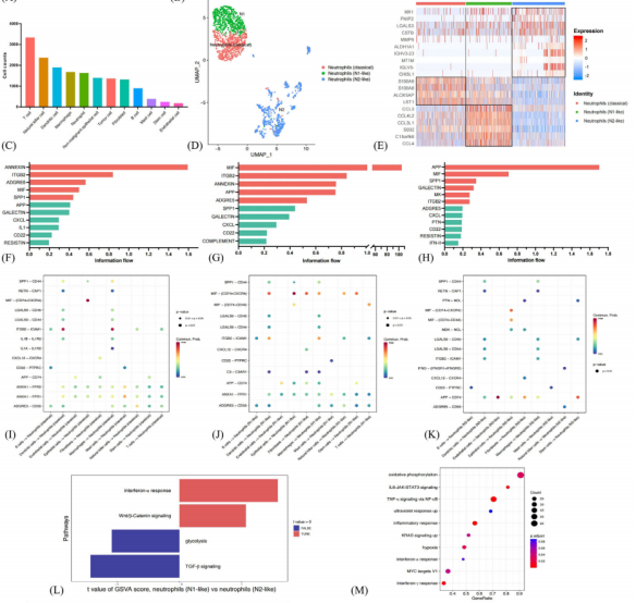 (1)肿瘤原发灶内中性粒细胞依据其转录特征可大致分为三个亚群,分别为经典亚型(高表达典型的中性粒细胞标记物,如S100A8和S100A9)、N1样亚型(高表达趋化因子和细胞因子标记物如CCL3、CCL4和抗原呈递标记物如HLA-DMB、CD74)、N2样亚型(高表达免疫抑制标记物如TGFBI、LAGLS3和促血管生成标记物如MMP9)
