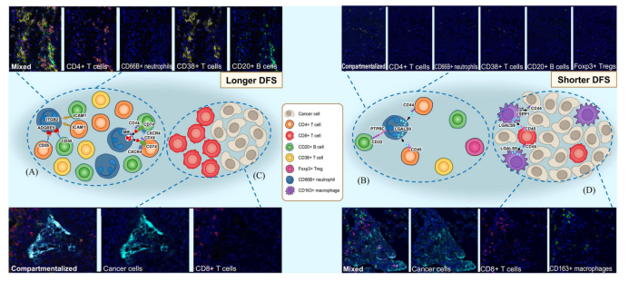 (2)B模式以免疫效应细胞间远隔分布为特征,可观察到更多的Treg,且中性粒细胞与CD4+ T细胞和CD20+ B细胞之间的距离更长。这种空间模式与较短的DFS相关