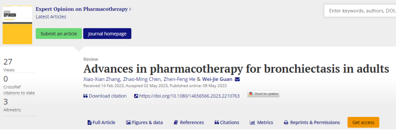 受期刊Expert Opinion On Pharmacotherapy(IF:4.1分)主编Rayya Hajjar教授的特邀,关伟杰研究员指导支扩课题组于2023年5月发表了题为“Advances in pharmacotherapy for bronchiectasis in adults”的特邀综述。