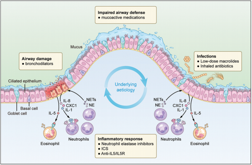 图1:根据恶性漩涡假说,支气管扩张的发病机制和药物治疗的潜在靶点