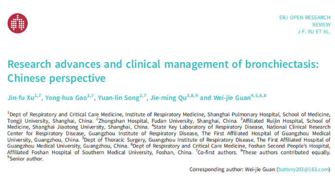 本文的共同第一作者包括上海肺科医院徐金富教授(中国支扩联盟副主席)以及高永华主任、复旦大学附属中山医院宋元林教授(中国支扩联盟副主席),资深作者为上海交通大学附属瑞金医院瞿介明教授(中国支扩联盟主席,中华医学会呼吸病学分会主任委员),通讯作者为关伟杰研究员。