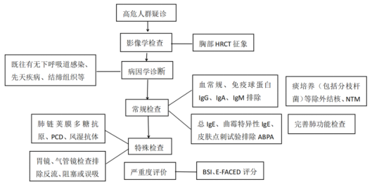 胸部高分辨率CT是支扩症放射学诊断的“金标准”,此外Bhalla评分可能会提供更多信息。支扩症与COPD和/或哮喘合并的患者临床预后较差,HRCT在识别该表型方面发挥了关键作用。在肺功能方面,由于肺部结构变化,支扩症患者可能表现出不同的气流受限模式,包括阻塞性、限制性或混合性损害。脉冲振荡法已被用于测定小气道阻力,肺清除指数可有效识别通气异质性,但单纯根据肺功能变化可能无法准确判断支扩症急性加重期。