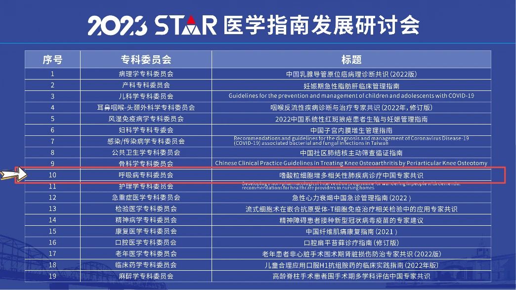 2023年8月18日上午,由中华医学会杂志社指南与标准研究中心、世界卫生组织指南实施与知识转化合作中心主办,兰州大学健康数据科学研究院、甘肃省循证医学与临床转化重点实验室、甘肃省医学指南行业技术中心承办,中国医学科学院循证评价与指南研究创新单元、Cochrane兰州大学中心、GRADE兰州大学中心、亚洲指南协会支持的“2023 STAR医学指南发展研讨会”在兰州大学逸夫科学馆召开。会上,STAR执行委员会共同主任委员、中华医学会杂志社魏均民社长兼总编辑公布了2022年度中国指南/共识科学性、透明性和适用性评级工具(STAR)的综合评级结果,由广州医科大学附属第一医院国家呼吸医学中心、国家呼吸系统疾病临床医学研究中心联合中华医学会呼吸病学分会哮喘学组,组织国内多学科专家编写的《嗜酸粒细胞增多相关性肺疾病诊疗中国专家共识》在本次评级中表现优异,获评为呼吸病学专科委员会最佳指南/共识奖。