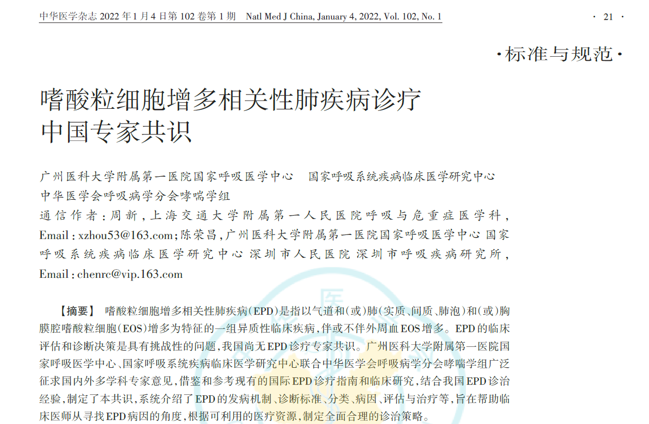 嗜酸粒细胞增多相关性肺疾病(EPD)是指以气道和(或)肺(实质、间质、肺泡)和(或)胸膜腔嗜酸粒细胞(EOS)增多为特征的一组异质性临床疾病,伴或不伴外周血EOS增多。EPD的临床评估和诊断决策是具有挑战性的临床问题。该共识系统介绍了EPD的发病机制、诊断标准、分类、病因、评估与治疗等,旨在帮助临床医师从寻找EPD病因的角度,根据可利用的医疗资源,制定全面合理的诊治策略。该共识为指导临床评估EPD的病因和建立疾病队列提供了参考。
