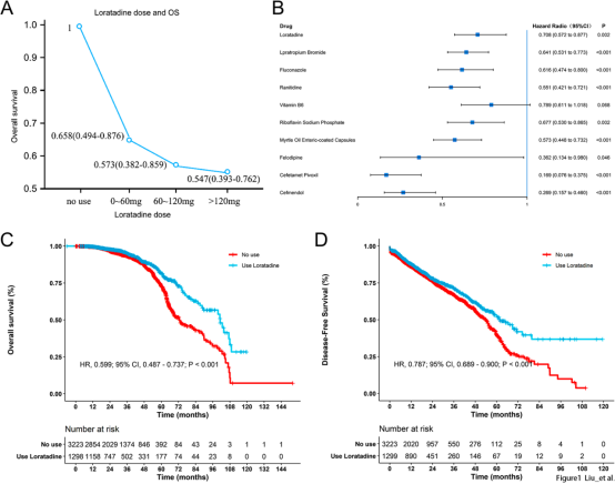 研究团队通过药物流行病学的模式,回顾性分析本中心2006年至2018年4522名肺癌患者的合并用药情况,使用Cox比例风险模型发现氯雷他定的使用史与肺癌患者更好的预后相关,且随着氯雷他定药物的累积使用量的增加,肺癌死亡率以剂量依赖的方式降低。