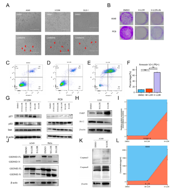 为了排除过敏性疾病的混淆作用,明确因果关系,该团队开展了实验研究,探究氯雷他定的抗肿瘤机制。结果发现不同浓度氯雷他定可发挥不同作用:中剂量氯雷他定诱导肿瘤细胞凋亡(Apoptosis)、衰老并减少上皮间质转化(EMT),而高剂量氯雷他定可触发肿瘤细胞焦亡(Pyroptosis)。