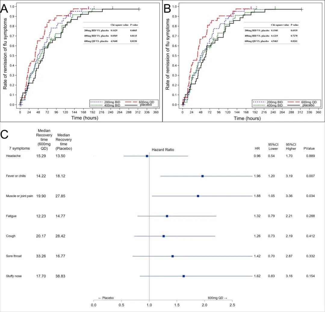 该项研究结果表明, 昂拉地韦能够显著缩短流感七项症状(咳嗽、咽痛、头痛、鼻塞、发热或寒颤、肌肉或关节痛和疲劳)缓解时间和缩短发热时间,并能快速降低和清除体内流感病毒,且安全性耐受性良好。