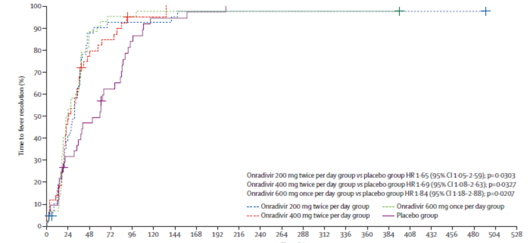 图3. 所有昂拉地韦组的退烧时间均明显短于安慰剂组