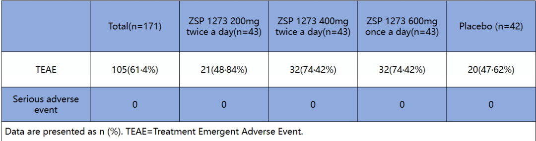 主要疗效结果显示,与安慰剂组TTAS中位时间62.87小时(IQR 36.40-113.25小时)相比,所有三个昂拉地韦组的TTAS中位时间均降低:200 mg,46.92小时(IQR 24.00-81.38小时);400mg,54.87小时(IQR为23.67-110.62小时);600mg,40.05小时(IQR 17.70~65.82小时);其中,昂拉地韦600mg组与安慰剂组的差异为22.82小时(P=0.0330)。所有昂拉地韦组的中位退烧(腑温<37℃)时间均明显短于安慰剂组(安慰剂组,60.27小时;昂拉地韦组,200mg, 31.93小时,HR 1.65, P=0.0303;400mg, 25.33小时,HR 1.69,P=0.0327;600mg, 23.88小时,HR 1.84,95%CI 1.88-2.88,P=0.0207)(图3)。昂拉地韦缩短了病毒浓度可测持续时间(安慰剂组,71.85小时;昂拉地韦组,200 mg,41.95小时,P=0.0037;400 mg,62.26小时,P=0.0048;600 mg,41.77小时,P=0.0066)。最常见的AE是腹泻(40.94%);本研究未观察到严重不良反应(表1)