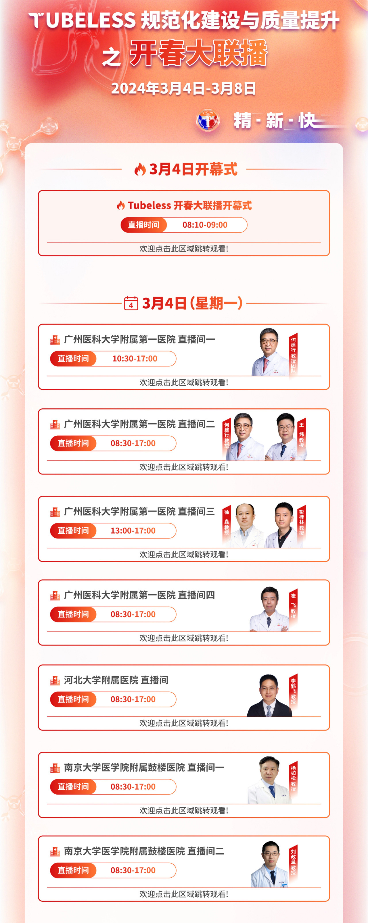 Tubeless规范化建设与质量提升之开春大联播”日程已过半,3天6个中心29台Tubeless手术展示,6.5万人次的观看,把这个活动推向了一个又一个的高潮。此时此刻,大疆南北关于Tubeless学术讨论的热情与温度都达到了一致。未来2天还有更多的精彩手术直播,欢迎各位继续关注!