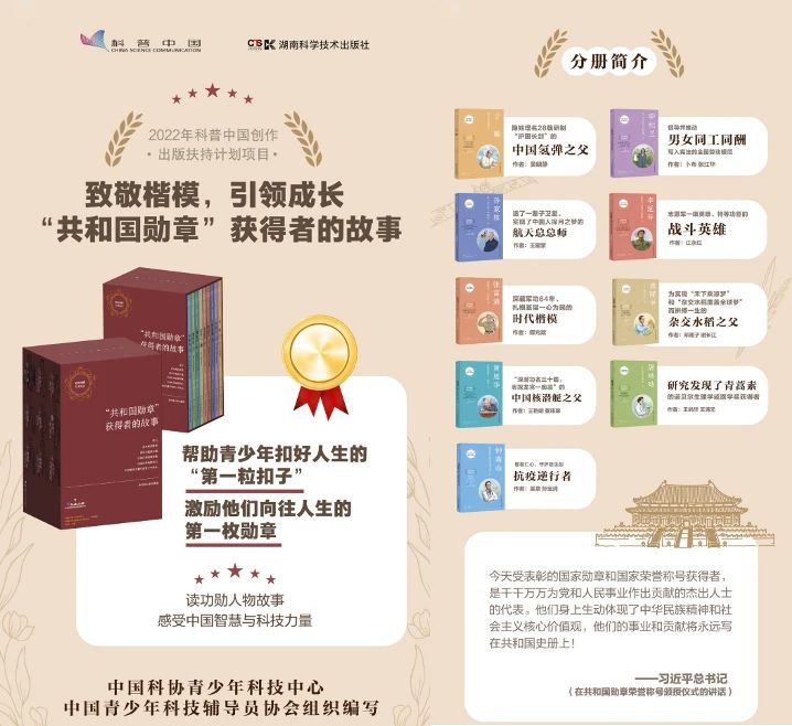 “共和国勋章”是中华人民共和国最高荣誉勋章,由国家主席向获得者亲自授予,并由国家专门立法支持。《“共和国勋章”获得者的故事》丛书共九册,由中国科协青少年科技中心和中国青少年科技教育工作者协会组织编写。这套丛书以童趣盎然的美文描绘了“共和国勋章”获得者的成长、求学、科研、工作和生活中的动人故事,全方位、多元化、立体化地展现了他们忠诚、执着、朴实的品格。这些功勋人物在各自的领域,用朴实纯粹、淡泊名利的精神书写了精彩的人生故事,用青春、热血和生命谱写了共和国的华彩篇章,激励着青少年读者向上向善,奋发奋进。