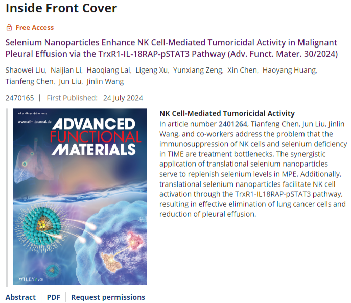 恶性胸腔积液(Malignant Pleural Effusion, MPE)是恶性肿瘤的难点热点,其特点是生长快、恶性程度高、治疗效果差。MPE中固有免疫细胞(NK细胞)数量减少和功能下降,导致抗肿瘤活性大幅下降的独特免疫抑制微环境(“冷”状态)是其治疗效果差的关键因素。广医一院、国家呼吸医学中心、广州呼吸健康研究院汪金林教授团队前期研究发现,MPE中微量元素硒的下降与MPE免疫功能抑制关系密切,纳米硒药物有望调控MPE的免疫“冷”状态为“热”状态(Translational Nanotherapeutics Reprograms Immune Microenvironment in Malignant Pleural Effusion of Lung Adenocarcinoma,AHM封面 ,IF10.0)。在此基础上,团队联合胸外科刘君教授团队和暨南大学纳米研究中心陈填烽教授团队进一步开发了具有免疫激活功能的纳米硒香菇多糖(LET-SeNPs),以MPE中功能抑制的NK细胞为研究对象,阐明了硒纳米粒子激活NK细胞的机制来实现肿瘤杀伤作用,实现恶性胸腔积液从免疫“冷”状态向“热”状态转化,从而开辟MPE局部治疗新策略,为LET-SeNPs实现基础临床转化奠定了良好基础。研究结果在Advanced Functional Materials (AFM, IF 18.5)以“封面论文”的形式发表Selenium Nanoparticles Enhance NK Cell-Mediated Tumoricidal Activity in Malignant Pleural Effusion via the TrxR1-IL-18RAP-pSTAT3 Pathway。系列研究表明,该团队在恶性胸腔积液的肿瘤免疫微环境的调控研究上取得了显著的成绩,医工结合的模式已经开启了胸膜疾病基础研究的一扇窗户。