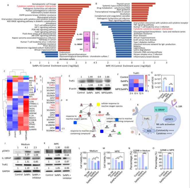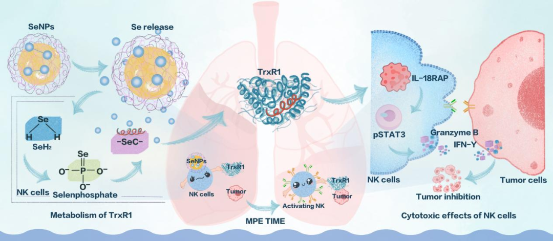 随后,为了进一步探究LET-SeNPs如何激活NK细胞功能活性的影响,他们采取了转录组学测序方法,精准探索出LET-SeNPs调控NK细胞活性是通过聚焦到硒蛋白(TrxR1)上,并首次发现IL-18RAP在NK细胞激活中的作用。进一步实验验证得出:LET-SeNPs通过TrxR1-IL18RAP-pSTAT3途径促进MPE-NK细胞活化,提高对肺癌细胞清除和减少胸腔积液的产生。
