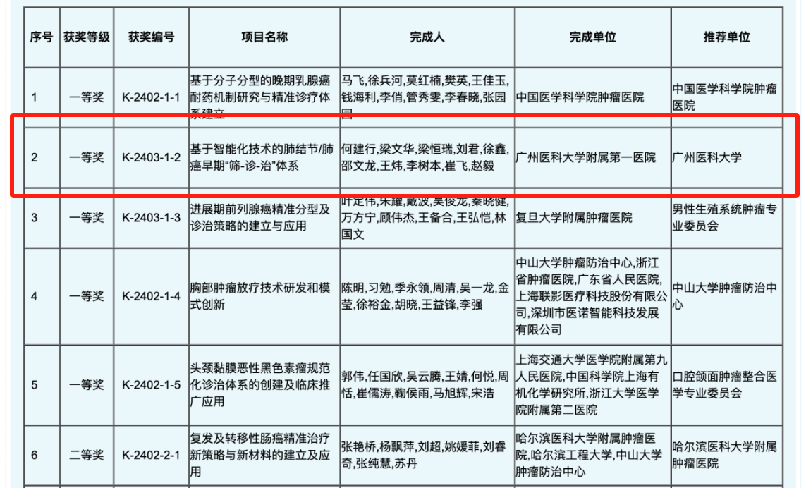 近日,2024年中国抗癌协会科技奖获奖项目公布,广州医科大学附属第一医院何建行教授团队《基于智能化技术的肺结节/肺癌早期“筛-诊-治”体系》项目荣获一等奖。