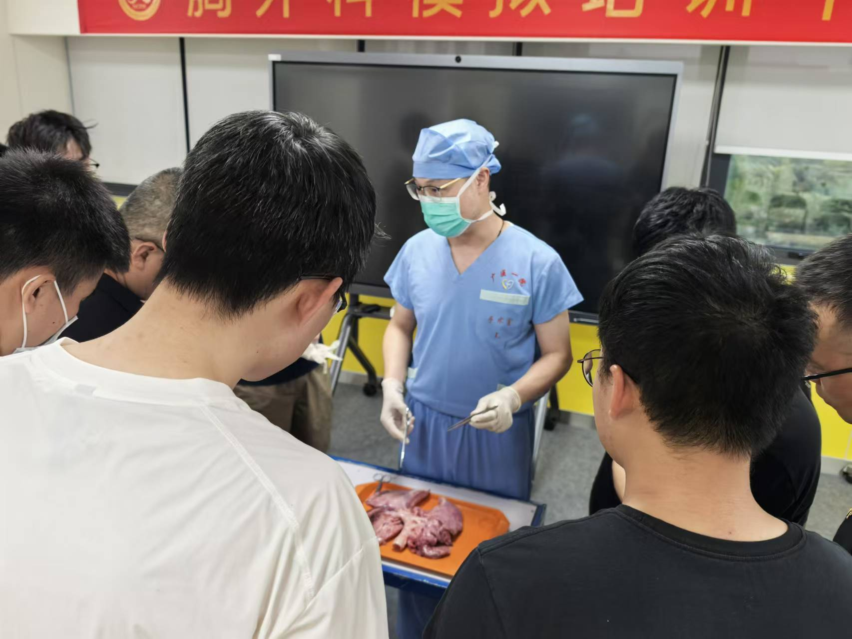 接下来,学员们按照分组进行实操训练,积极练习所学内容。通过分组练习,学员们不仅得到了动手操作的机会,还在相互交流和讨论中进一步理解并掌握了胸外科基本操作的要点。同时,黄主任在实践过程中为学员们提供了及时的指导和反馈,帮助他们发现并纠正操作中的问题。