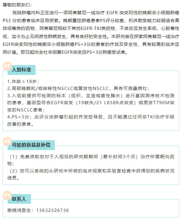 【受试者招募】EGFR突变且PS=3分肺癌患者