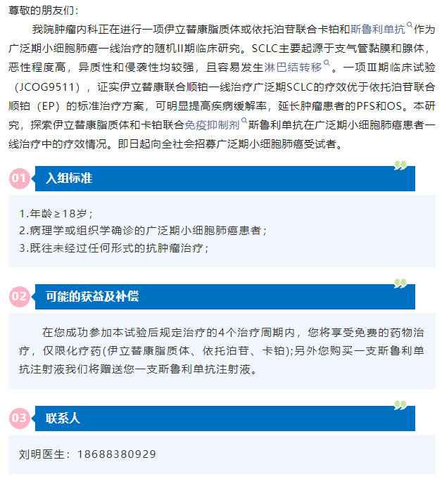 【受试者招募】广泛期小细胞肺癌患者