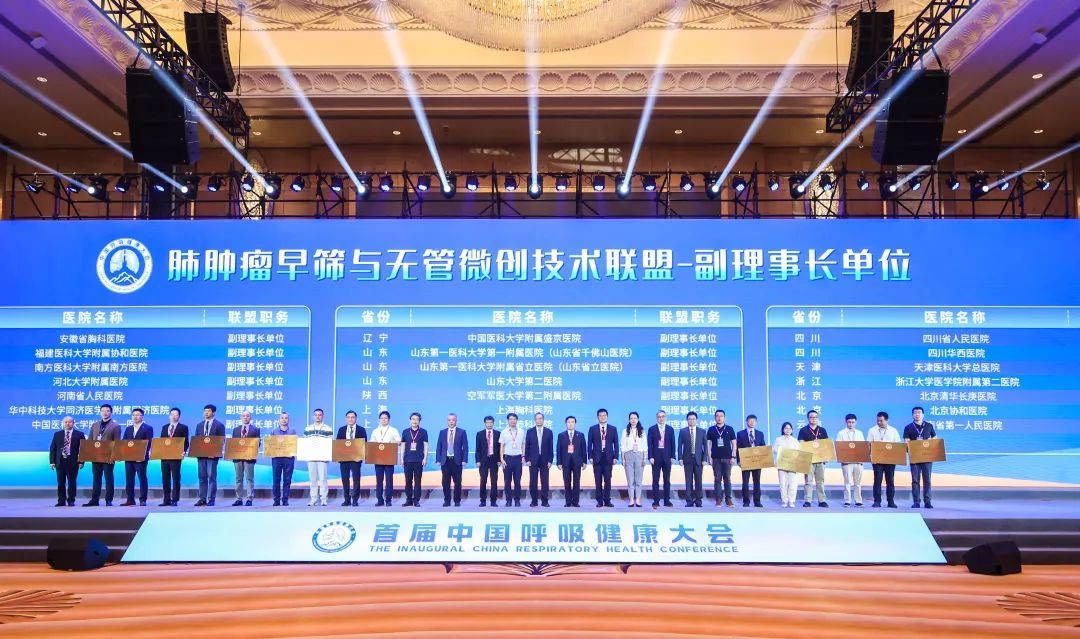 为有效降低肺癌的发病率与死亡率,促进患者康复进程,广州医科大学附属第一医院和国家呼吸医学中心共同发起成立了肺肿瘤早筛与无管微创技术联盟。10月12日,在首届中国呼吸健康大会开幕式上启动了肺肿瘤早筛与无管微创技术联盟授牌仪式。