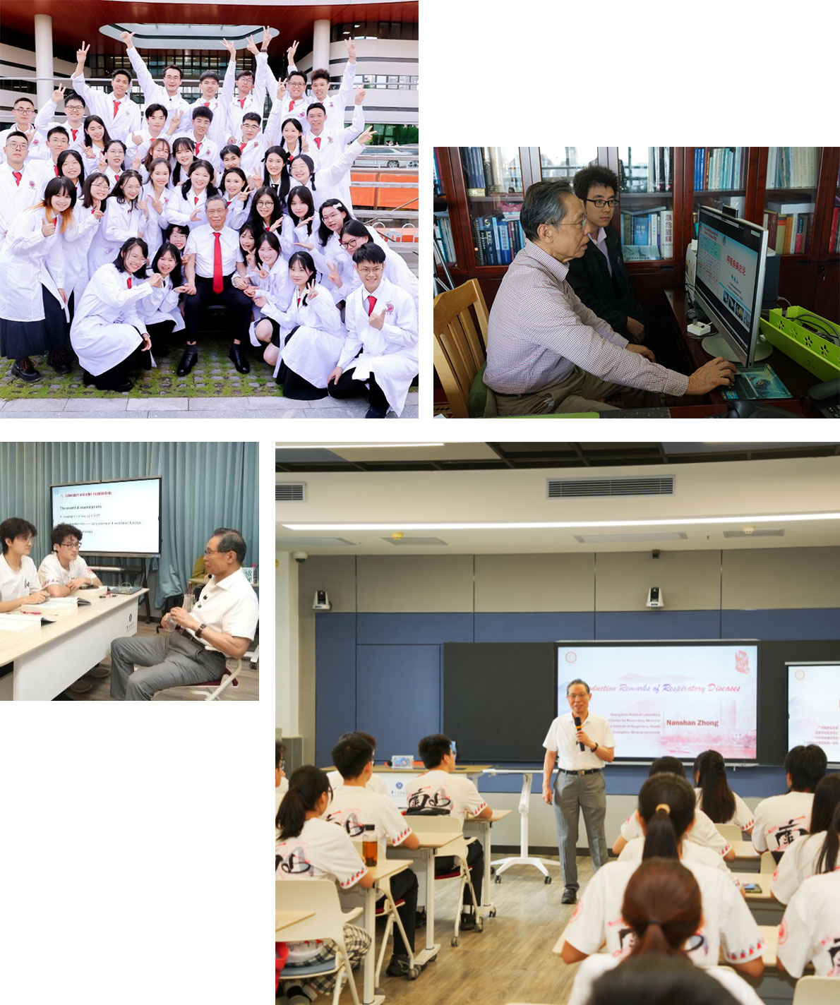 钟南山院士在2020年全国抗击新冠肺炎疫情表彰大会上荣获“共和国勋章”。钟院士每年亲自面试选拔南山班学生,指导南山学院各项工作的开展,多年来坚持为南山班本科生授课。