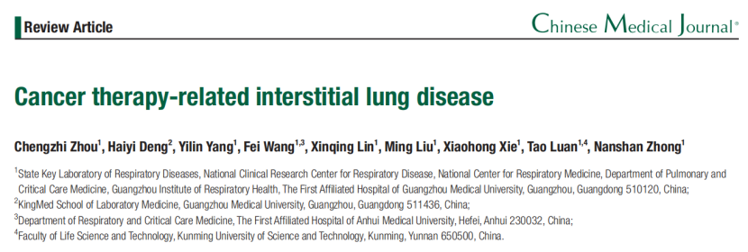 2024年10月11日,广州医科大学附属第一医院、国家呼吸医学中心钟南山院士团队,在Chinese Medical Journal(CMJ)在线发表综述“Cancer therapy-related interstitial lung disease”(图1)。随着肿瘤治疗方式的发展和新药的出现,以肿瘤治疗相关间质性肺疾病(Cancer therapy-related interstitial lung disease, CT-ILD)为主的肿瘤呼吸病学(Oncology-Respirology)逐渐成为了临床的关注焦点。本综述总结了CT-ILD的发病机制、危险因素及临床特征,并综合研究进展和临床经验总结了完整的诊断流程、提出了分级、分型、分期的个体化精准管理模式。