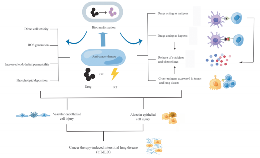 图2 肿瘤治疗相关间质性肺疾病(CT-ILD)的病理生理学