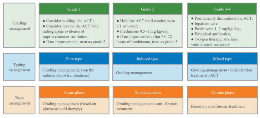 基于病情和病因,CT-ILD可以分为单纯型、诱导型和混合型。诱导型是指患者免疫微环境在其他药物、病毒、放疗等诱导下发生了改变,进而在加入抗肿瘤治疗时所导致的CT-ILD。对于此类患者,我们建议除了停用抗肿瘤治疗,还需停用可能的诱导剂;此外,考虑病毒诱导时应予抗病毒治疗。混合型定义为合并感染、肿瘤进展等的CT-ILD。除基础治疗外,混合型患者还需治疗合并疾病,如抗感染、抗肿瘤治疗等。
