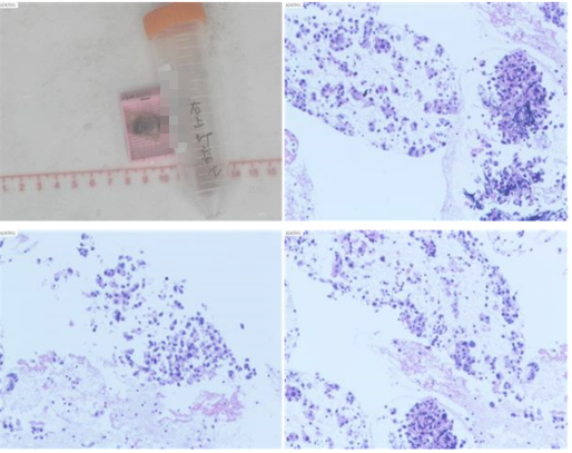 广州医科大学附属第一医院病理科赵主任对病理切片进行判读,镜下观察到肿瘤组织呈条索状和实性结构,肿瘤细胞核形态不规则或圆形,胞浆丰富,核分裂少,提示可能为肺源性非小细胞癌。进一步免疫组化染色检测结果显示:肺腺癌标记物TTF-1和NapsinA均为阳性,而肺鳞癌标记物P40和P63均为阴性。结合镜下形态学表现和免疫组化结果,最终诊断为肺腺癌。