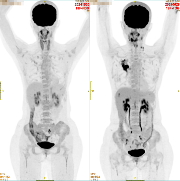 ②原右肺门及左侧锁骨上高代谢淋巴结现代谢降至本底水平。