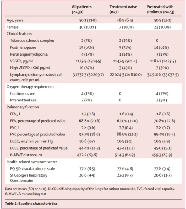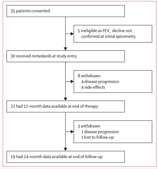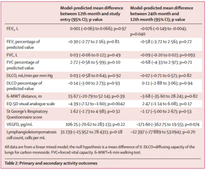 这项2期、开放标签、单臂研究是在意大利米兰的国家罕见肺部疾病中心MultiMedica IRCCS进行的。符合条件的参与者年龄在18岁及以上,患有散发型或与结节性硬化症相关的淋巴管平滑肌瘤病,并且在过去一年中尽管接受了西罗莫司治疗或未接受任何治疗,仍然出现了肺功能逐渐下降的情况。患者每天口服两次150毫克尼达尼布,如果出现不良事件或肝毒性,剂量可减少至每天两次100毫克,治疗期12个月,后续是12个月的观察期。主要研究终点是治疗12个月FEV1(第一秒用力呼气肺活量)变化(以FEV1的斜率表示,单位为L)。本研究已在ClinicalTrials.gov注册,注册号为NCT03062943。