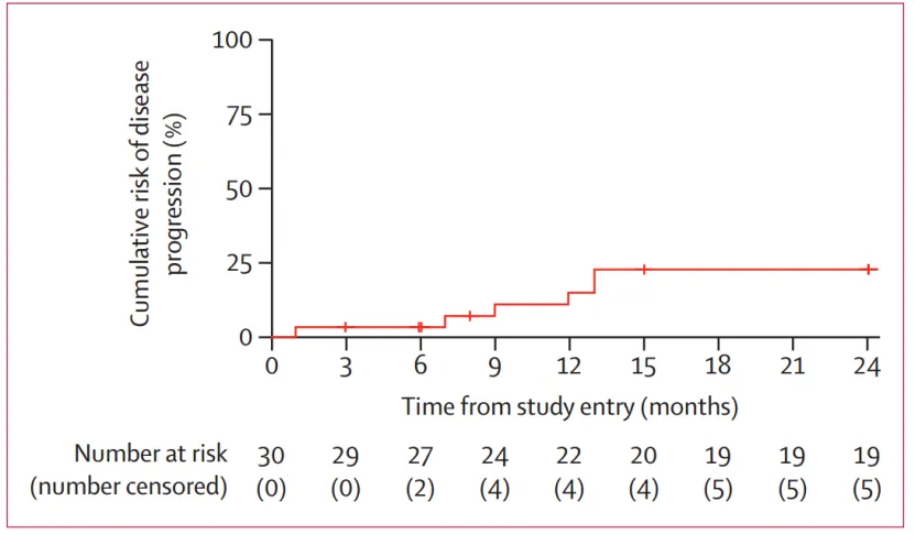 图4.疾病进展的累积风险。观察到6名疾病进展的患者(在治疗阶段有4名,治疗结束后有2名)。由于副作用停止治疗的患者(4名)或失访的患者(1名)在分析中被删失。删失时间用刻度标记表示。