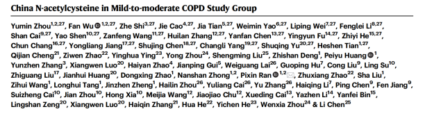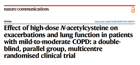 2024年10月,由广州医科大学附属第一医院/呼吸疾病全国重点实验室/国家呼吸医学中心/国家呼吸系统疾病临床医学研究中心/广州国家实验室冉丕鑫教授团队牵头全国24家医院开展N-乙酰半胱氨酸治疗轻中度慢阻肺患者药物临床试验结果发表于Nature Communications杂志,题为“Effect of high-dose N-acetylcysteine on exacerbations and lung function in patients with mild-to-moderate COPD: a double-blind, parallel group, multicentre randomised clinical trial”。该研究是在噻托溴铵治疗轻中度慢阻肺的Tie-COPD研究(N Engl J Med. 2017;377:923-935. ERJ Open Res. 2019;5:00175-2018. Respir Med. 2024;222:107527)之后又一项重要的轻中度慢阻肺患者早期治疗的循证医学证据。