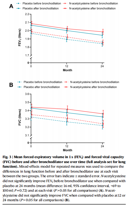 N-乙酰半胱氨酸是一种具有抗氧化作用的黏液溶解剂,既往研究发现对于频繁急性加重的中重度慢阻肺患者长期规则治疗可以显著减少急性加重发生且耐受性良好(Lancet Respir Med. 2014;2:187-194)。N-乙酰半胱氨酸对没有频繁急性加重的轻中度慢阻肺患者的疗效尚不明确。因此,冉丕鑫教授牵头多中心、随机、双盲、安慰剂对照试验,探讨N乙酰半胱氨酸治疗轻中度慢阻肺的患者有效性。该研究随机分配968例轻中度慢阻肺患者接受N-乙酰半胱氨酸(600 mg,每日两次)或安慰剂治疗,治疗期两年。主要研究终点是年急性加重发生率和吸入支气管扩张剂前FEV1自基线至治疗24个月的改变量的组间差异。慢阻肺急性加重的定义为咳嗽、咳痰、咳脓痰、喘息、呼吸困难等五个症状中至少两个或以上症状新发或加重,且持续至少48小时。每三个月评估一次急性加重情况,入组后每年检查一次肺功能。