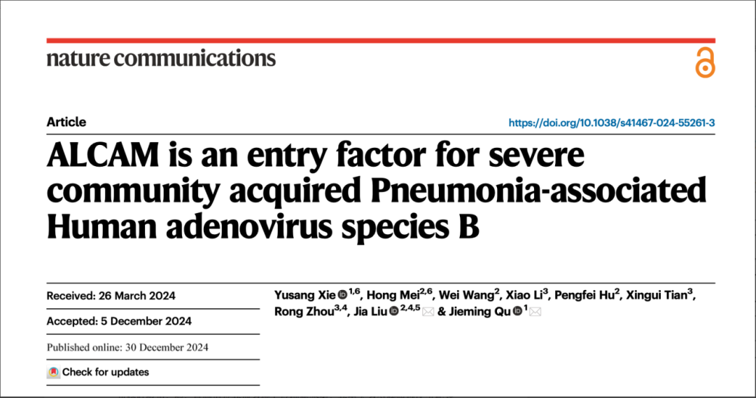 2024年12月30日,上海交通大学医学院附属瑞金医院瞿介明教授团队,与上海科技大学免疫化学研究所刘佳教授团队合作,在Nature子刊杂志《Nature Communications》 【IF 14.7,Q1】在线发表论文“ALCAM is an Entry Factor for Severe Community Acquired Pneumonia-associated Human Adenovirus Species B”。该研究通过系统CRISPR/sgRNA功能基因组筛选结合重症社区获得性肺炎(SCAP)患者转录组学数据,首次发现并鉴定了SCAP相关人B组腺病毒新型侵入相关宿主因子,为后续抗病毒药物研究提供理论依据。