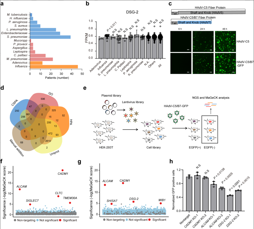 研究人员构建了嵌合HAdV-B7纤维结蛋白(knob)的重组荧光病毒,利用一代和二代膜蛋白组CRISPR/sgRNA文库(SfCRISPR)对重组毒株进行两轮独立筛选,确定了包括已知的受体DSG2和激活白细胞黏附分子(ALCAM)在内的一系列候选宿主因子。