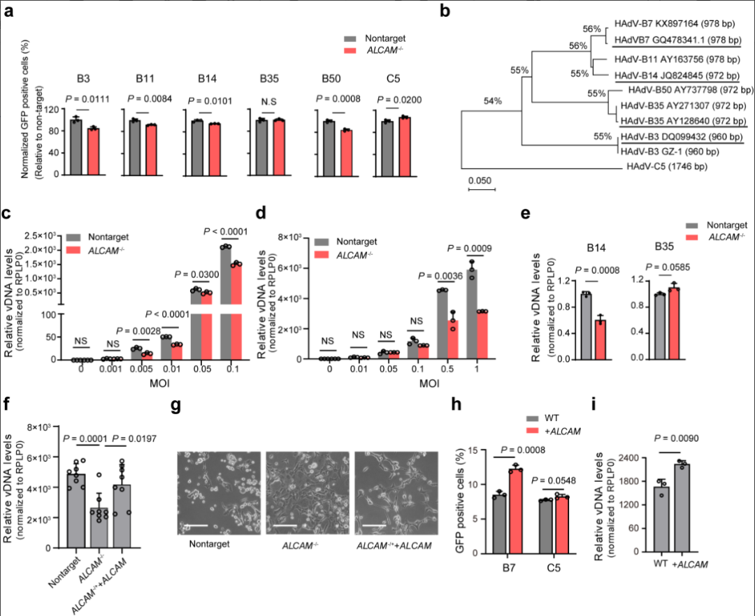 研究人员发现候选宿主因子ALCAM在SCAP患者早期血样中高表达,而在体外共感染实验中,ALCAM功能缺失细胞较野生型细胞抵抗重组腺病毒感染。并进一步构建了敲除及回补细胞系,通过功能缺失实验及回补实验验证了ALCAM促进腺病毒感染。随后在临床分离的多株重症B组腺病毒中验证了ALCAM广泛促腺病毒感染。